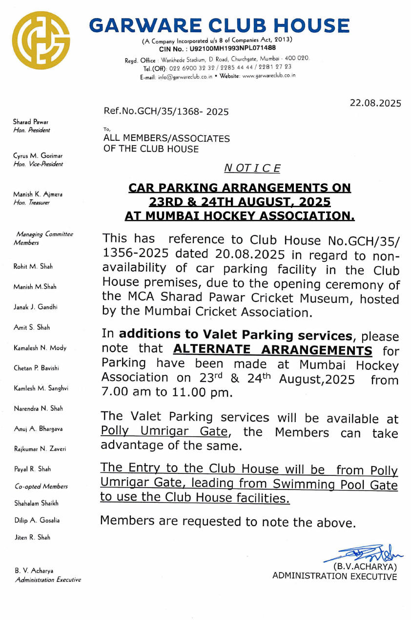 Car Parking Arrangements on 23rd & 24th August, 2025