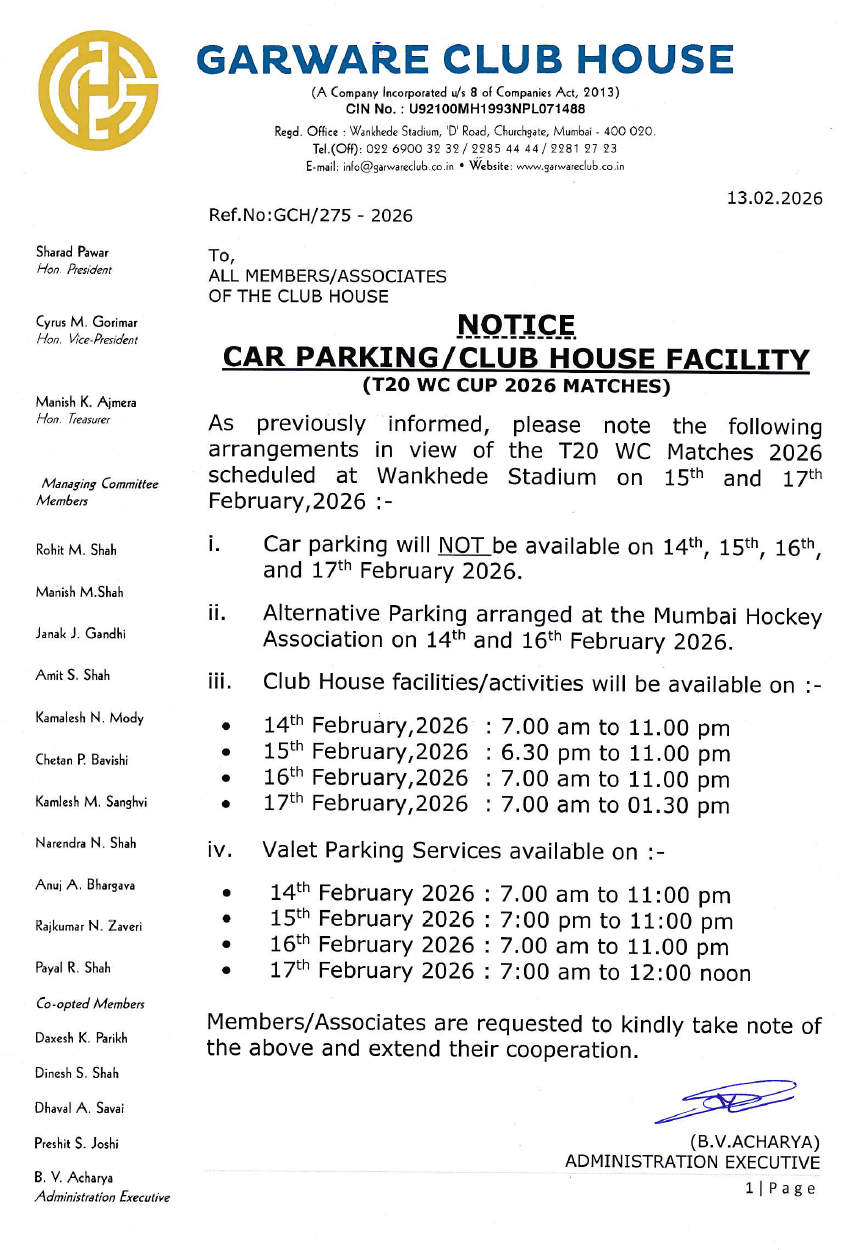 Notice Dt.13.02.2026 Regarding Car Parking & Club House Facilities (T20 Mens WC 2026 Cricket Matches)