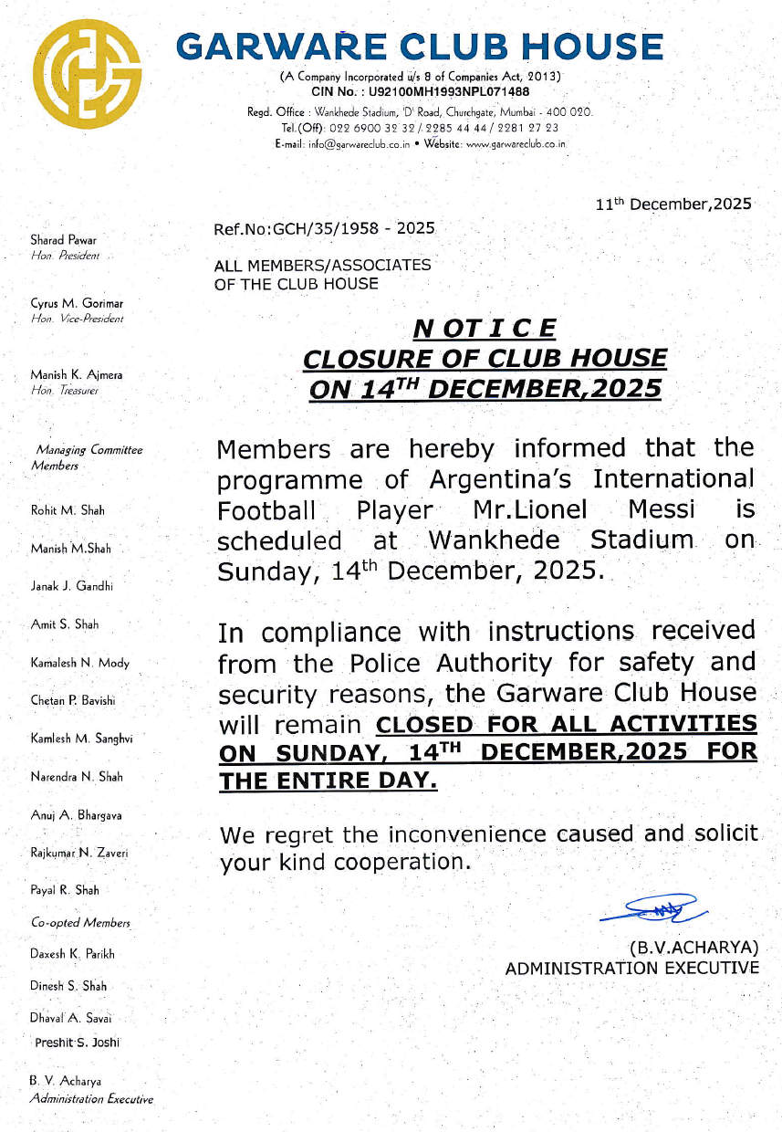 Notice Dt. 11.12.2025 Regarding Closure of Club House on 14.12.2025