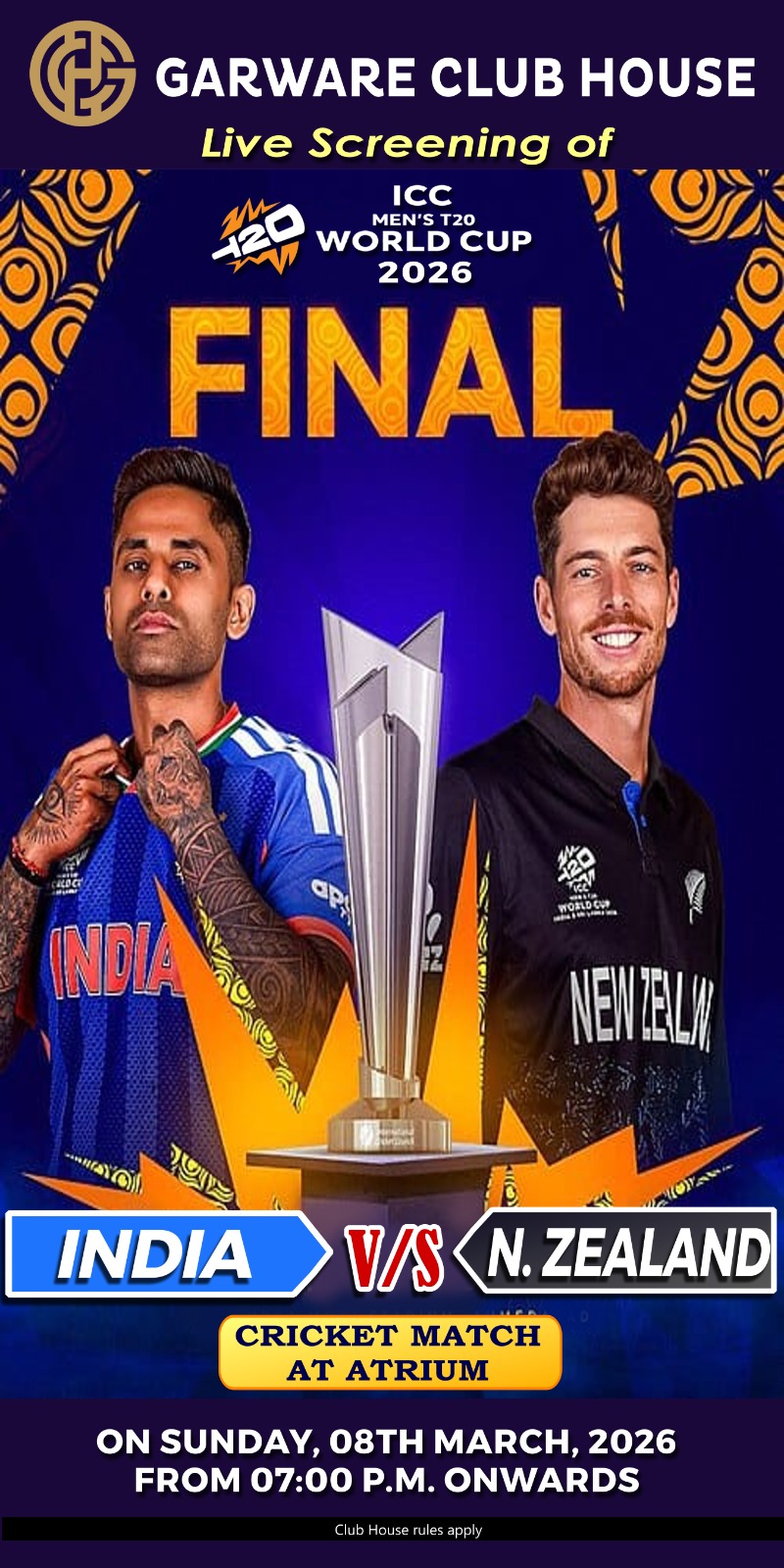 Live Screening of ICC T20 Mens World Cup 2026 Finals Cricket Match India vs New Zealand, at Atrium from 7 PM Onwards.