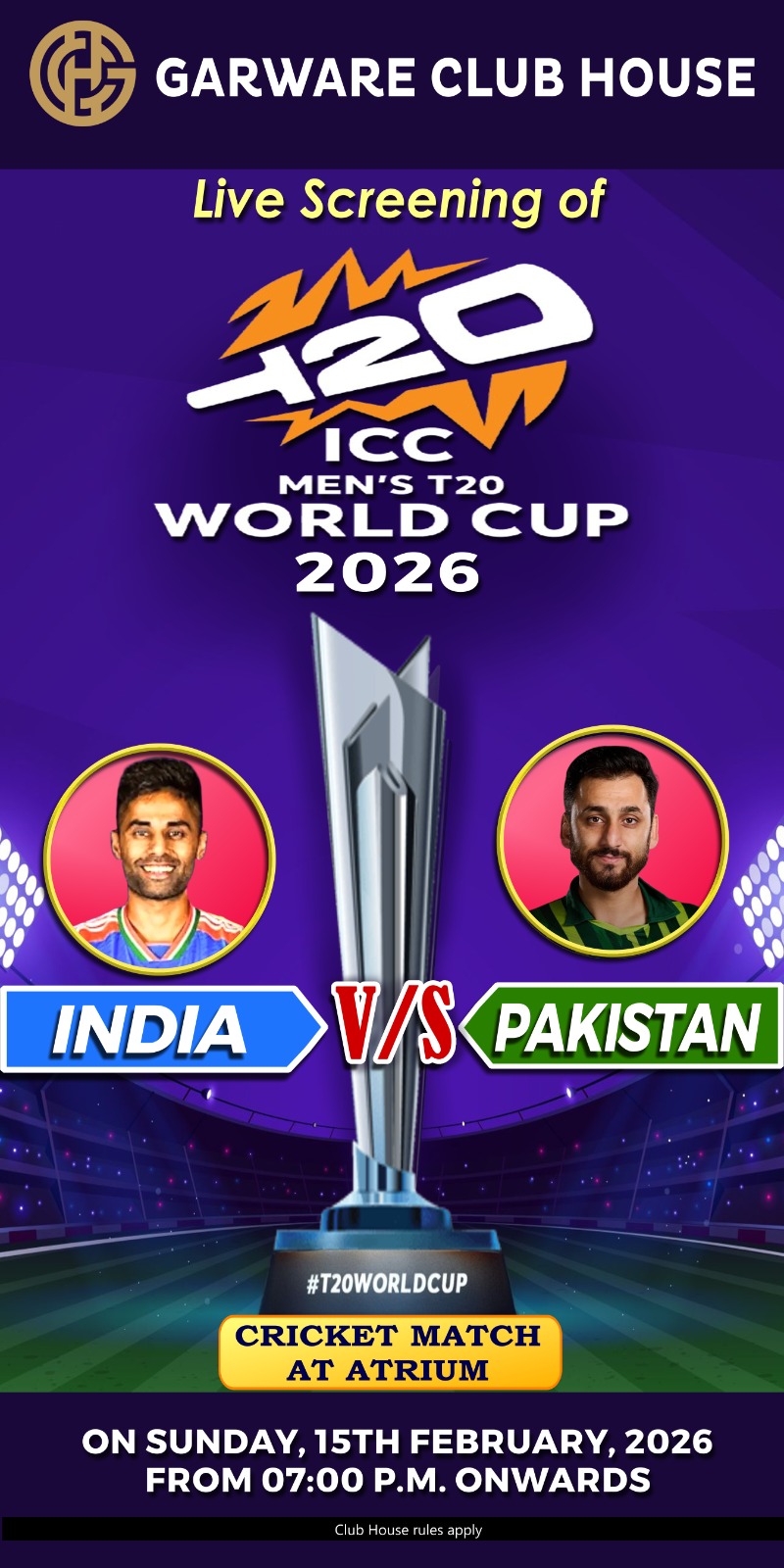 Live Screening of T20 Mens World Cup 2026 Cricket Match, India vs Pakistan, on Sun, 15 Feb, 7 PM