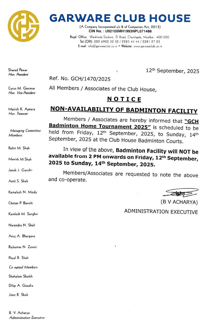 Notice Dt.12.09.2025 Regarding Non-availability of Badminton Facility