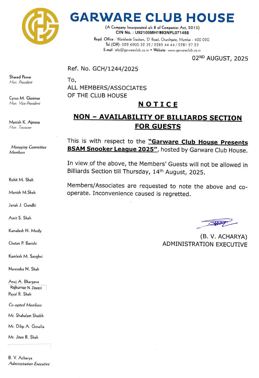 Notice Dt. 2 Aug 2025 Regarding Non-availability of Billiards Section for Guests