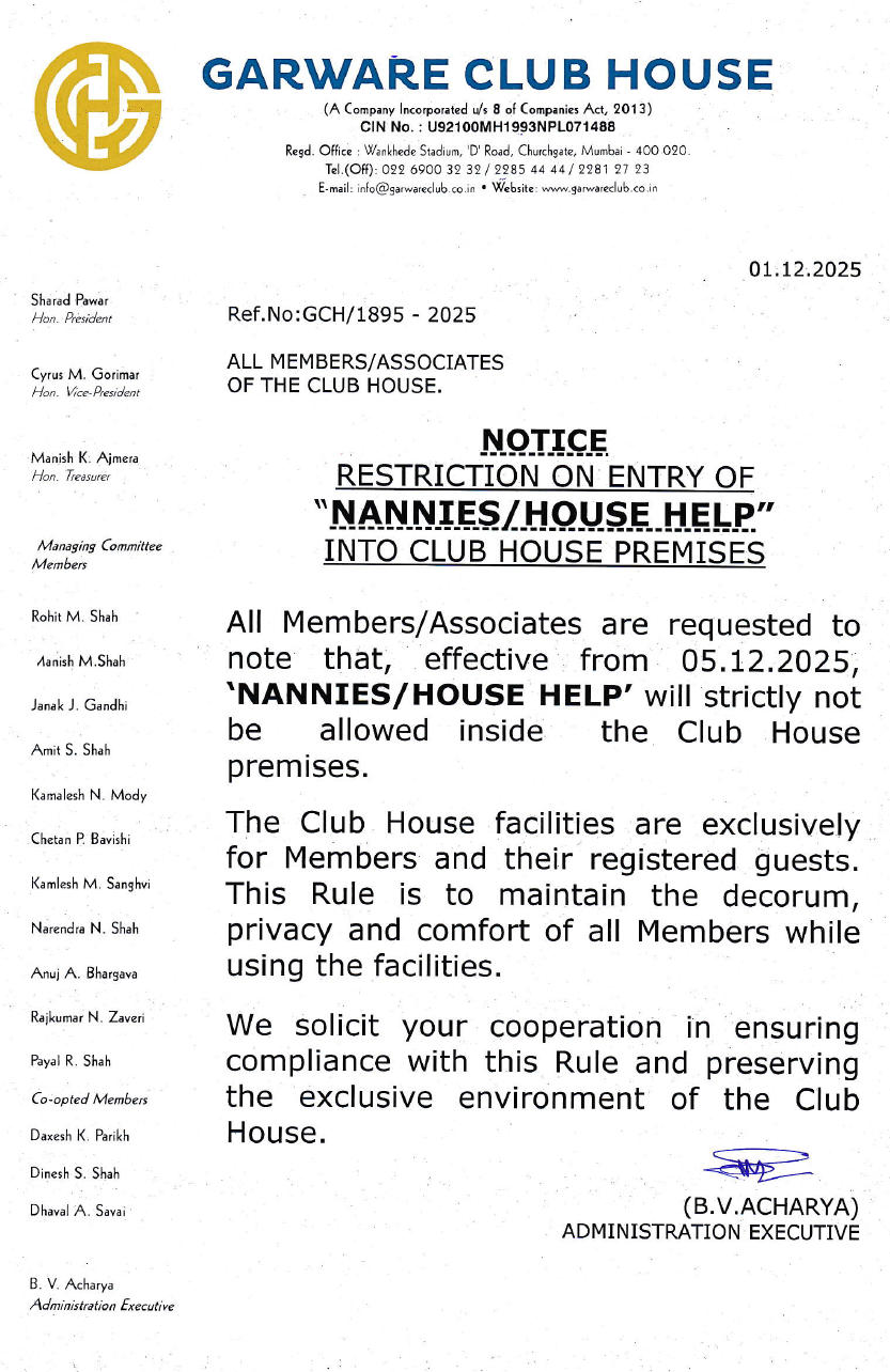 Notice Dt. 01.12.2025 Regarding Restriction on Entry of “Nannies / House Help” Into Club House Premises
