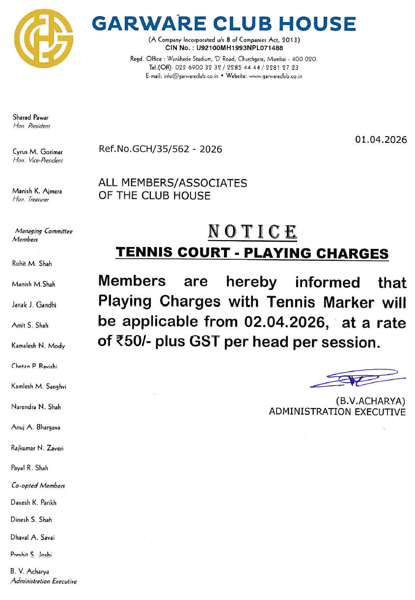Notice Dt. 01.04.2026 – Tennis Court – Playing Charges
