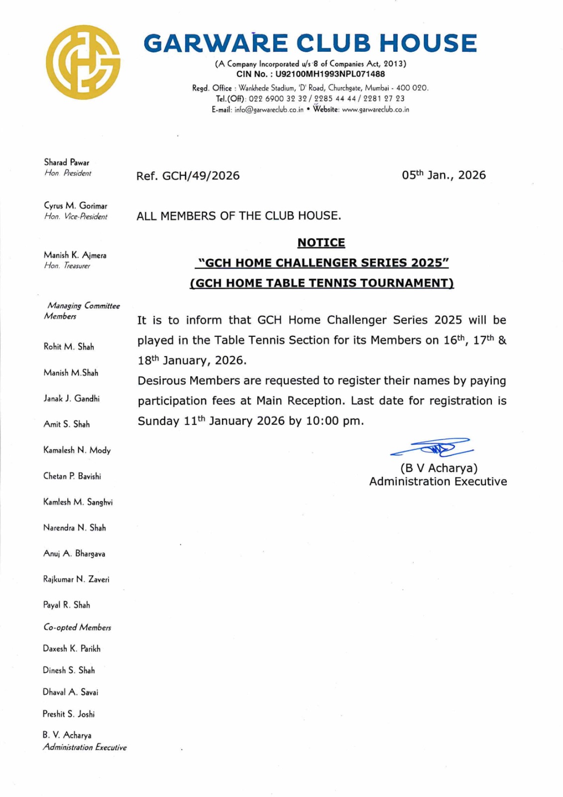 Notice Dt. 05.01.2026 Regarding GCH Home Challenger Series 2026 (Home Table-tennis Tournament)