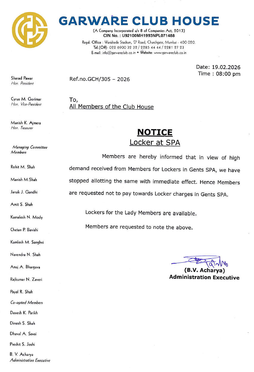 Notice Dt. 19 Feb 2026 Regarding Locker at Spa