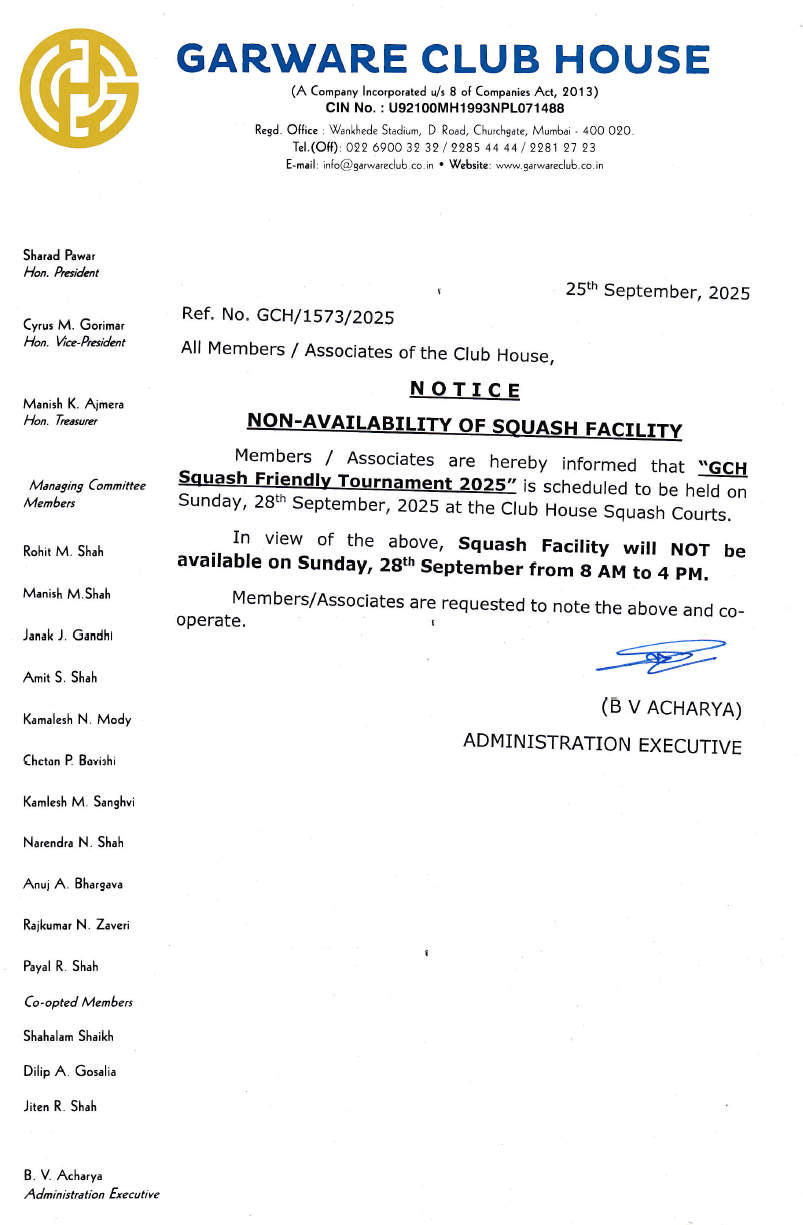 Notice Dt.25.09.2025 – Non-availability of Squash Facility