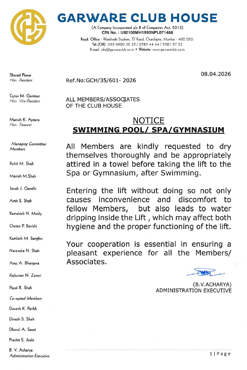 Notice Dt.08.04.2026 Regarding, Swimming Pool/ Spa/ Gymnasium