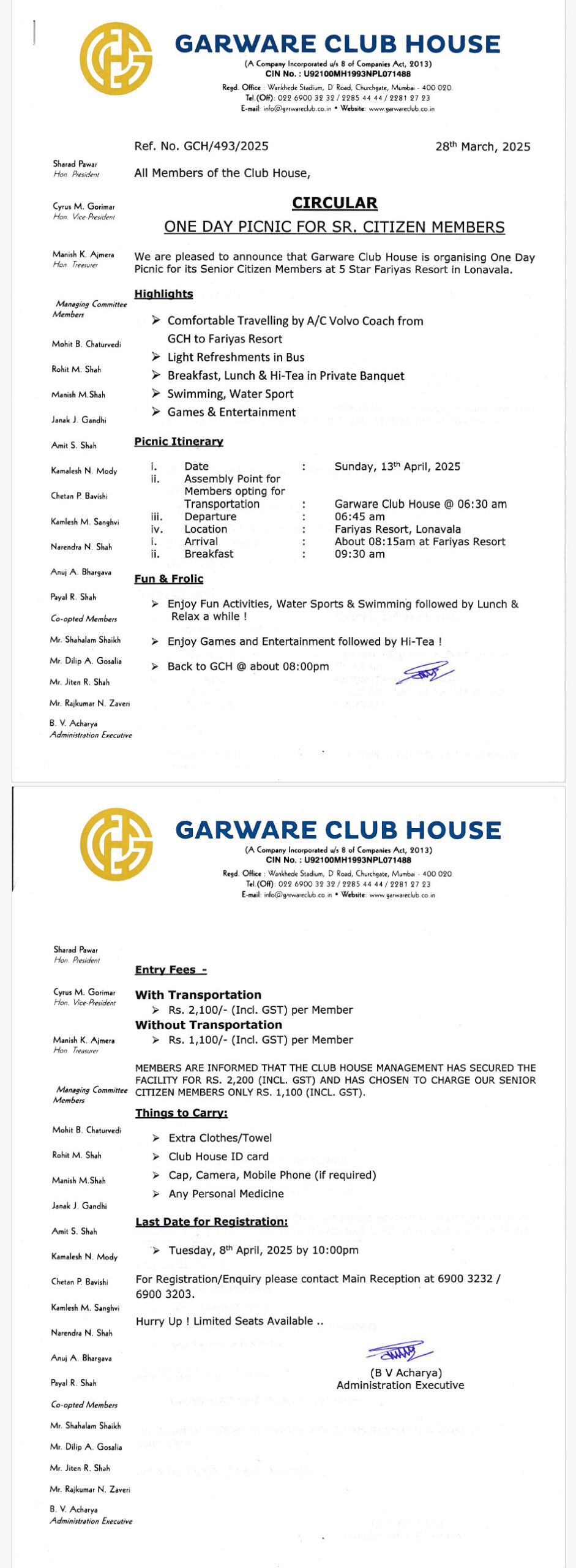 Circular Dt.28.03.2025 Regarding Gch Picnic for Senior Citizen Members to 5 Star Fariyas Resort on Sun, 13th April, 2025