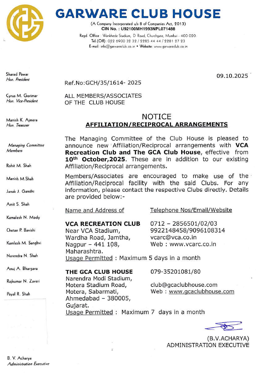 • Affiliation / Reciprocal Arrangements – Newera Goa Gymkhana Club