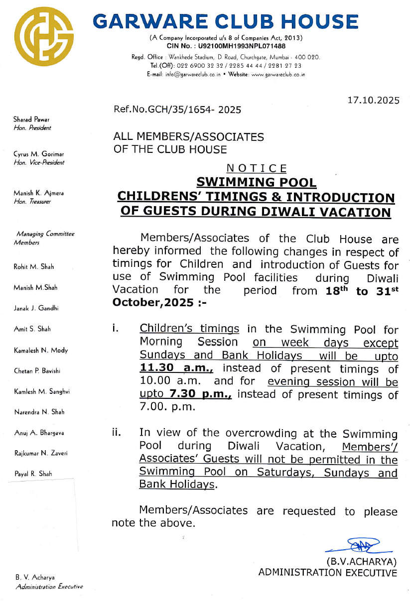 Notice Dt.17.10.2025 Regarding Swimming Pool Childrens’ Timings & Introduction of Guests During Diwali Vacation
